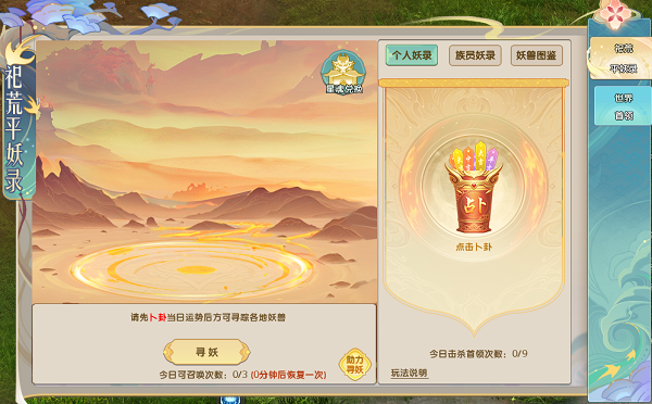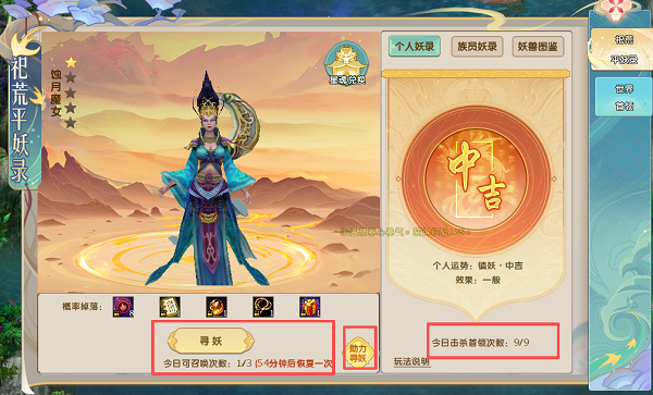 每个人每天获得奖励次数最多9只哦,可以自己召唤也可以组队打队友召唤出来的BOSS,反正就尽量选择高等级的打呗,每人每天可随着时间获得至多3次寻妖次数用于寻找魔物位置。注意:不是每天只能召唤3次哦,有倒计时的,倒计时结束后你就又可以召唤了。