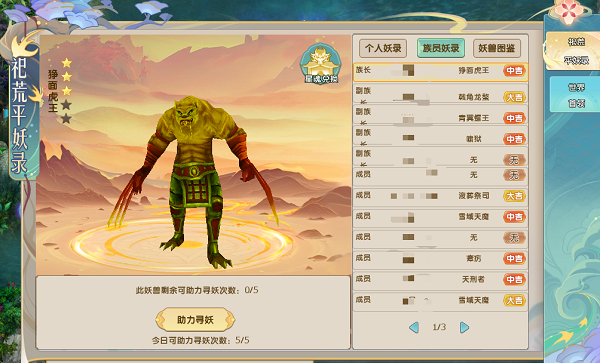 有没有宝子们注意过我们除了能看到个人妖录,那旁边还有个族员妖录,可以看到家族小伙伴们所召唤的妖物等级呢,这就是有家族的好处啦,家族长或副家族长每天首次帮助家族成员助力寻妖将会有更高的概率获得高质量妖兽。