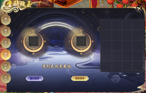 在魂玉界面背包,选中想要变形的魂玉,右键选择变形。然后在变形界面,消耗银两和变形玉即可完成变形。注意:变形有随机变形和指定变形,都是只改变形状,不改变属性和品质。变形消耗的银两也是不绑定的银两哦,且变形需要两颗以上的魂玉才可以变形哦。