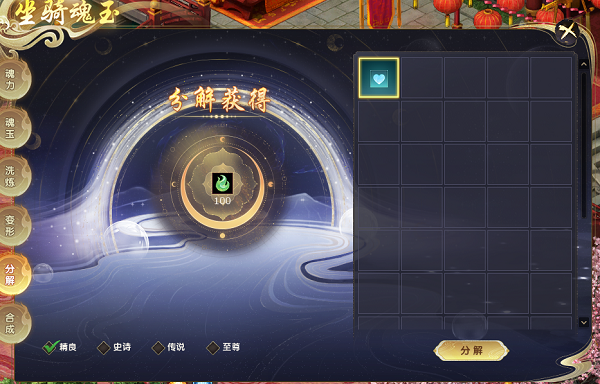 打开分解界面,选择想要分解的魂玉,或者勾选品质框,一键选择对应的品质的所有魂玉进行分解。注:精良魂玉可分解100个洗炼玉,史诗魂玉可以分解450个洗练玉,传说魂玉可分解1300个洗练玉,至尊魂玉可分解3000个洗炼玉。