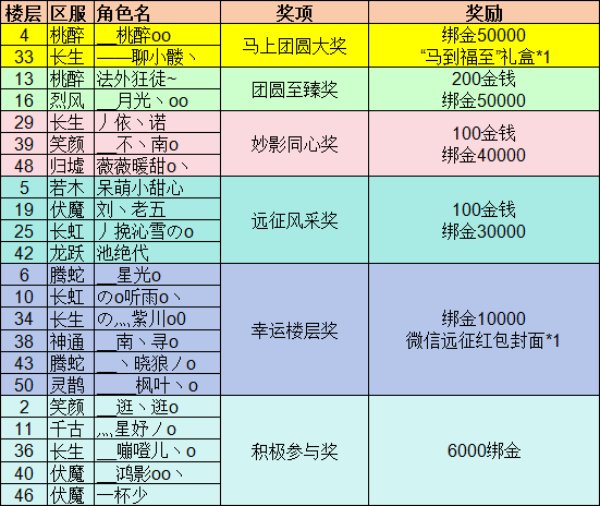 现将最终获奖名单公布如下。请特别注意:获得“马到福至”实物礼盒的2位玩家,请务必于今日内私聊楼主,提供您的真实邮寄信息(收件人/电话/地址)以便我们寄出礼盒。其余游戏内奖励将于公布名单起3个工作日内发放至角sè邮箱,金钱发至参加活动的论坛ID,敬请查收。